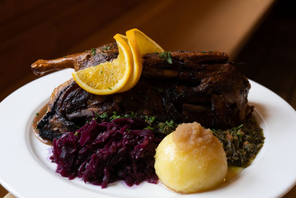 Halbe Brandenburger Bauernente – täglich frisch aus dem Ofen und serviert mit den klassischen Beilagen: Kartoffelknödel, Apfelblaukraut und feine Entensauce. Dazu ein schönes Glas Rotwein oder natürlich auch unser bestes Augustiner Bier in verschiedenen Sorten frisch vom Fass.
