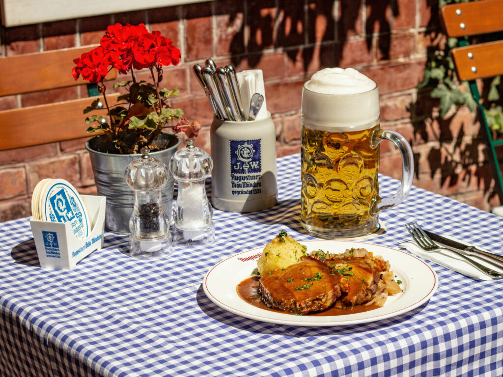 Freuen Sie sich auf gutbürgerliche Küche und bestes Augustiner Bier frisch vom Fass. Genießen Sie bei Ihrem Besuch die traditionelle bayrische Wirtshausküche und regionale Brandenburger Spezialitäten sowie typische Brauhaus Klassiker – immer mit einem Lächeln und herzlicher Gasfreundschaft serviert. Wir laden Sie ein, Platz zu nehmen und die Geselligkeit zu spüren,